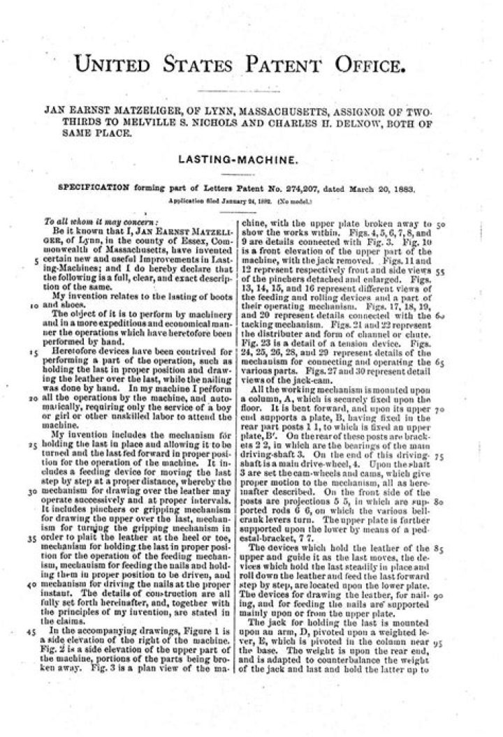 Working alone and at night for six months, he produced a model in wood and on March 20, 1883, received a patent (see photograph). His invention won swift acceptance and within two years had largely supplanted hand methods in Lynn.