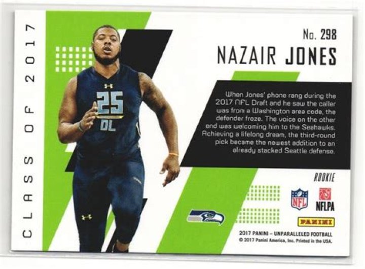 In the Seattle Seahawks’ opening game against the Green Bay Packers, Jones made his professional regular season debut. He recorded one tackle, intercepted a pass and returned an interception for touchdown in their 17-9 loss. Jones intercepted a pass from Aaron Rodgers (originally a screen pass for Lance Kendricks), and returned it for a touchdown of 64 yards in the first quarter. His touchdown was nullified by Cliff Avril’s penalty for an illegal block in his back during the return. The Packers refused to penalize cornerback Jeremy Lane for punching during the play. Jones was inactive on November 5, 2017 after Sheldon Richardson sustained an oblique injury. Jones received his first career start. Jones was credited with half of a sack and three combined tackles in the Seahawks’ 17-14 defeat to the Washington Redskins. Jones made his debut solo tackle the following week and recorded two solo tackles during Week 10, when he had his first solo sack. Jones’s first solo sack in his career was against Cardinals’ quarterback Drew Stanton, who lost eight yards in the fourth quarter. He had four combined tackles in Week 11 as the Seahawks lost to the Atlanta Falcons 34-31. The Seattle Seahawks placed Jones on injured reserve on December 30, 2017. Jones was inactive for four weeks (Weeks 13-16) after suffering a high ankle injury in Week 12. Jones finished his rookie season 2017 with 19 combined tackles (10 solo), three pass defenses and two sacks in 11 games. He also made two starts.